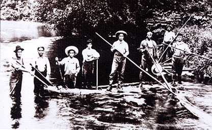 "THESE ARE SOME OF THE MEN WITH CANT HOOK AND PEAVEY, WHO HAD THE HAZARDOUS JOB OF ASSEMBLING BOOMS ON THE LAKE OR RIDING HERD ON THE LOGS, STAMPEDING IN THE RAPIDS OF THE RIVER."