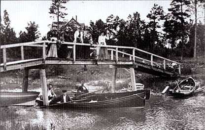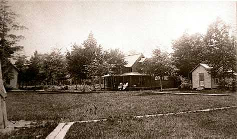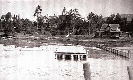 The above picture shows the original cottage of the Ware family, located on the S. W. corner of Pavilion Park. The plank walk in the foreground leads to the windmill, ehich supplied water to the resort. Part of the windmill support shows to the far left. The building in the distance, far left, was the Music Hall, where for several years Sunday services were held.