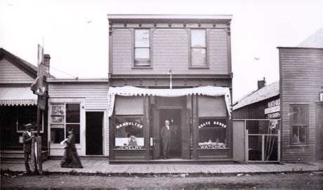 A SECTION OF BRIDGE STREET The stores pictured above were located on the west side of Bridge Street just south of the Odd Fellows building, a part of it being visible in the upper right corner. From left to right: A bakery (next to the alley), the E. J. Todd Bootery, the M. S. Moulton Jewelry shop, and a Tin Shop that was owned by M. J. Stockman. The A. Buttars building, which housed the clothing store of Geo. Miller, and the frame building in which Charlevoix's first drug store, owned by George Crouter, was established, were across the street. At the present time the site is occupied by the Charlevoix Abstract & Engineering SCo., and summer shops, which come and go.