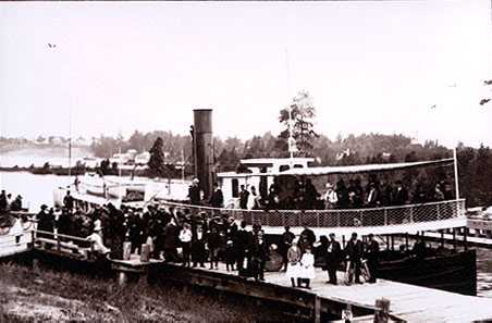 One of the most popular of the small steamers of the Eighties and Nineties was the "THOMAS FRIANT," shown above in 1888, tied up at the Belvedere dock in the upper channel. Obviously a special occasion, the only clue to its meaning would be the presence of the Ithaca K. of P. band, which might possibly have had something to do with the formation of the local lodge of the Knights of Pythias.