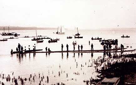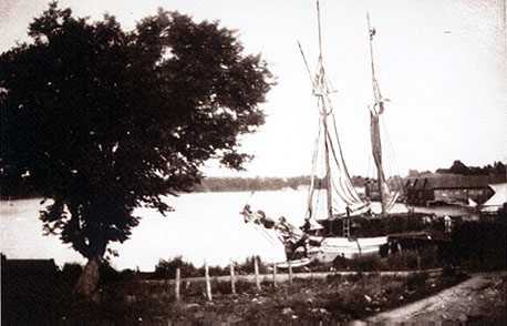 A schooner, fully loaded with lumber, drying sails while moored in the southwest corner of Round Lake.