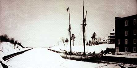 The "SEA GEM" in the lower channel, tied up at the Roller Mill dock for the winter. The constantly moving currents of water precluded damage to the ship by crushing ice.