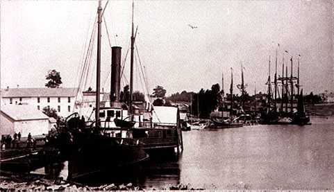 (In the above picture the "ANDREW JOHNSON" is seen docked in Round Lake between Antrim Street and Mason Street. A Mackinaw boat and several two- and three-masted schooners can be seen in the background.)