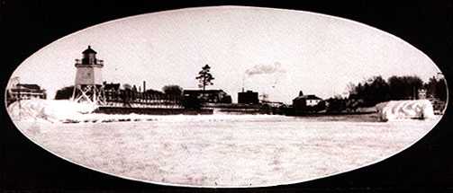 This unusual winter scene, taken in 1904, shows, from left to right, the Beach Hotel, the lighthouse on the north pier, the stack of the lumber mill, the Fountain City House, the Roller Mill, the Swing bridge, the Lewis Grand Opera House, the ice covered south pier, and the Life Saving Station.