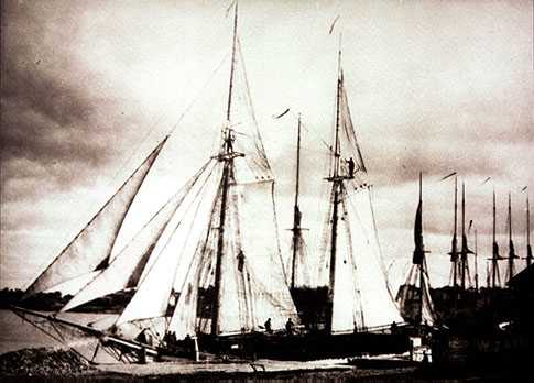 Having sought shelter from a Lake Michigan storm the schooner PORTER, tied up at a dock near Clinton Street, dries her sails.