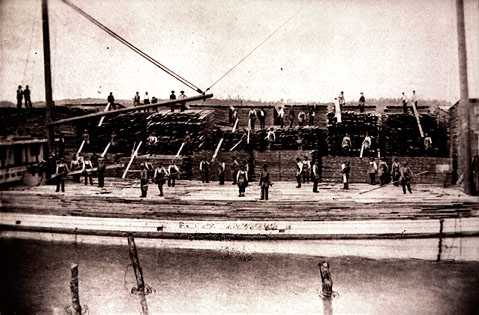 Fifty-five men loading the "THREE BROTHERS" with lumber at Boyne City, 1905. The ship was named after the White Brothers, pioneer business men and lumber kings of Boyne City.