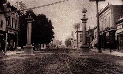 The building on the far left was the Crouter Drug Store. The upper floor housed Charlevoix's first telephone exchange. Next door was the Sugar Bowl, owned and operated by Geo. Glados for over fifty years. At the present time, 1972, it is known as the Bay Chalet Restaurant. Shaded by the clump of trees was the home of Major Greene. The small building on the extreme right of the picture was Shepherd's Hardware. And south of it, across the alley, was Levinson's Dry Goods Store. It is now Lieberman's. The Chamberlain home stood on the corner where the Charlevoix County State Bank now stands. Shortly after the Charlevoix Fire Dept. was formed their first call was at Chamberlain's. By pumping water from Round Lake they put out the fire. The pillars in the street were part of an activity of the Masonic Lodge, but just what the occasion was is not definitely known. About 1909 George VanPelt built the present Feindt building. It was used for the Post Office for many years. In 1910 he bought the Levinson store building. He remodeled the whole structure and put a brick front. The telephone exchange was moved from the Crouter building across the street into the rooms above Levinson's, where "Number please" was the order of the day for many years.