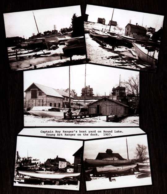 Captain Roy Ranger's boat yard on Round Lake. Young Art Ranger on the dock. 1907.