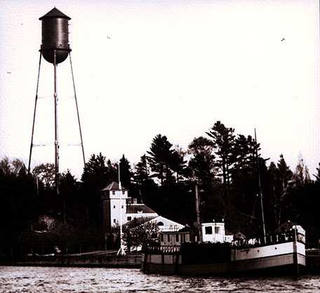 The tender "SUMAC," tied up at the supply depot in the upper channel near the railroad bridge. The United States Coast Guard station was moved from its original site on the lower channel to this location in the sixties.