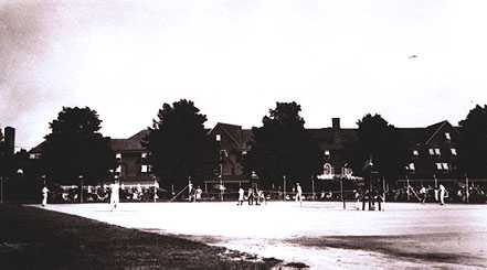 The Great Lakes Invitational tennis tournament was held on the clay courts of the INN during the twenties. In the above picture on the far court, far left, is George O'Connell, Mid-west champion. On the near court, far left, is John Hennessey, member of the Davis Cup team. Hennessey entered many of these tournaments and was never defeated.