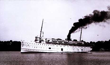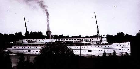 The S.S. ISLE ROYALE, formerly the MANITOU, steams through the upper channel into Lake Charlevoix to turn around.