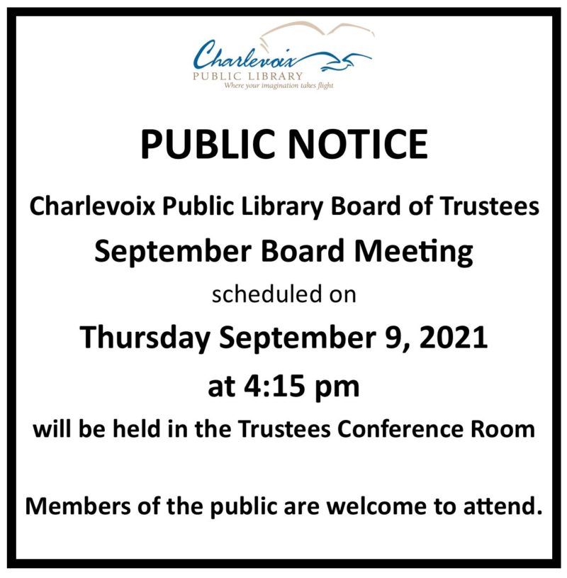 Public Notice: Monthly Meeting of the Library Board of Trustees, Thursday September 9, 2021 at 4:15 PM